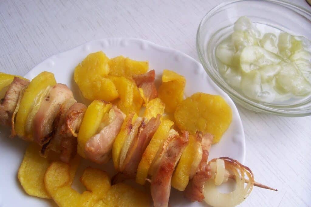 Először egy krumplit, majd 1 hagymát, 1 húst, 1 cukkinit, megint 1 hagymát, 1 húst, 1 krumplit és így tovább felfűzzük a hozzávalókat.