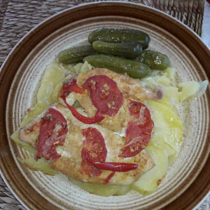 Csirkemell hagymás burgonyán sütve